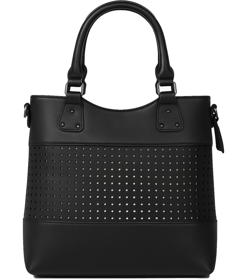 Stylová dámská kabelka David Jones v elegantní černé barvě je ideální doplněk pro každý den. Vyrobena z kvalitní eko kůže s moderním perforovaným designem, který jí dodává jedinečný vzhled. Nabízí prostornou hlavní komoru, pevné uši i nastavitelný ramenní popruh pro pohodlné nošení.