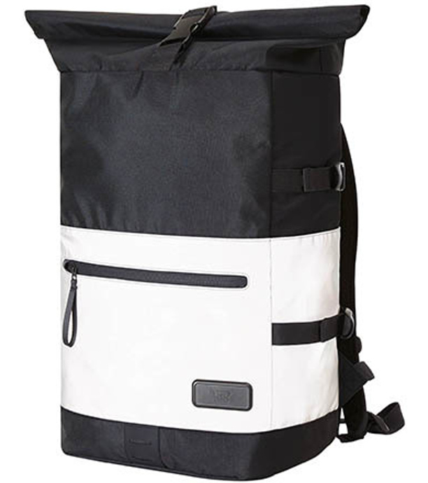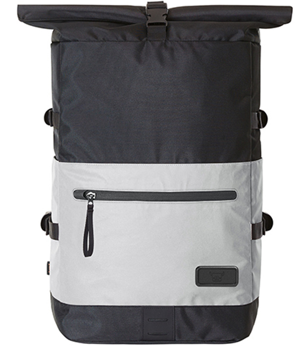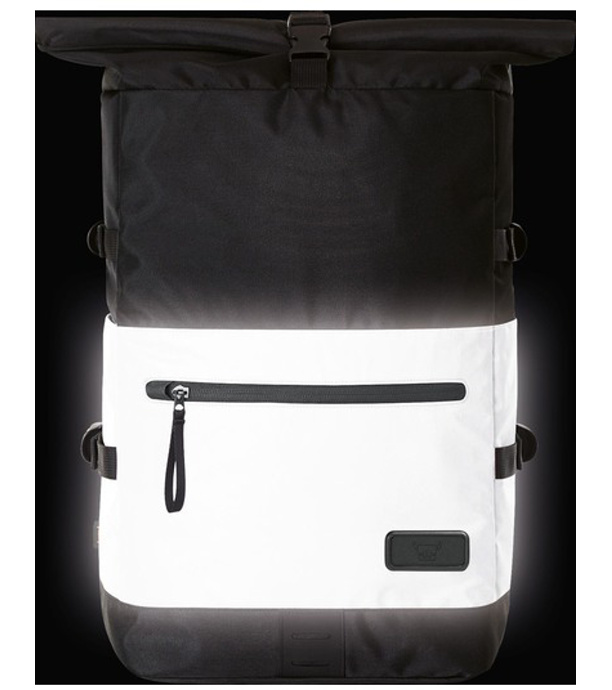 Štýlový reflexný batoh s rolovacím horným okrajom, hlavným oddielom na zips a zapínaním na pracky