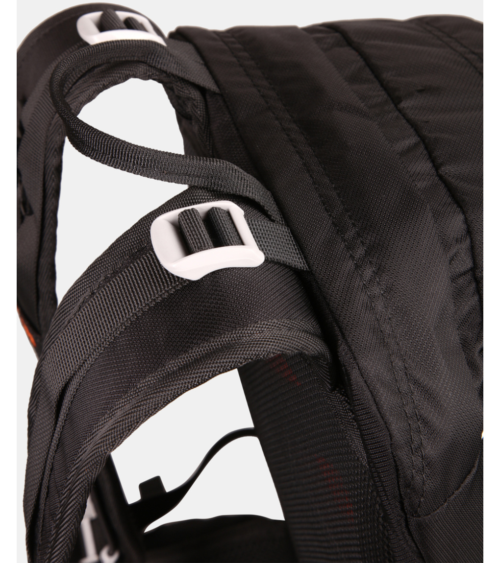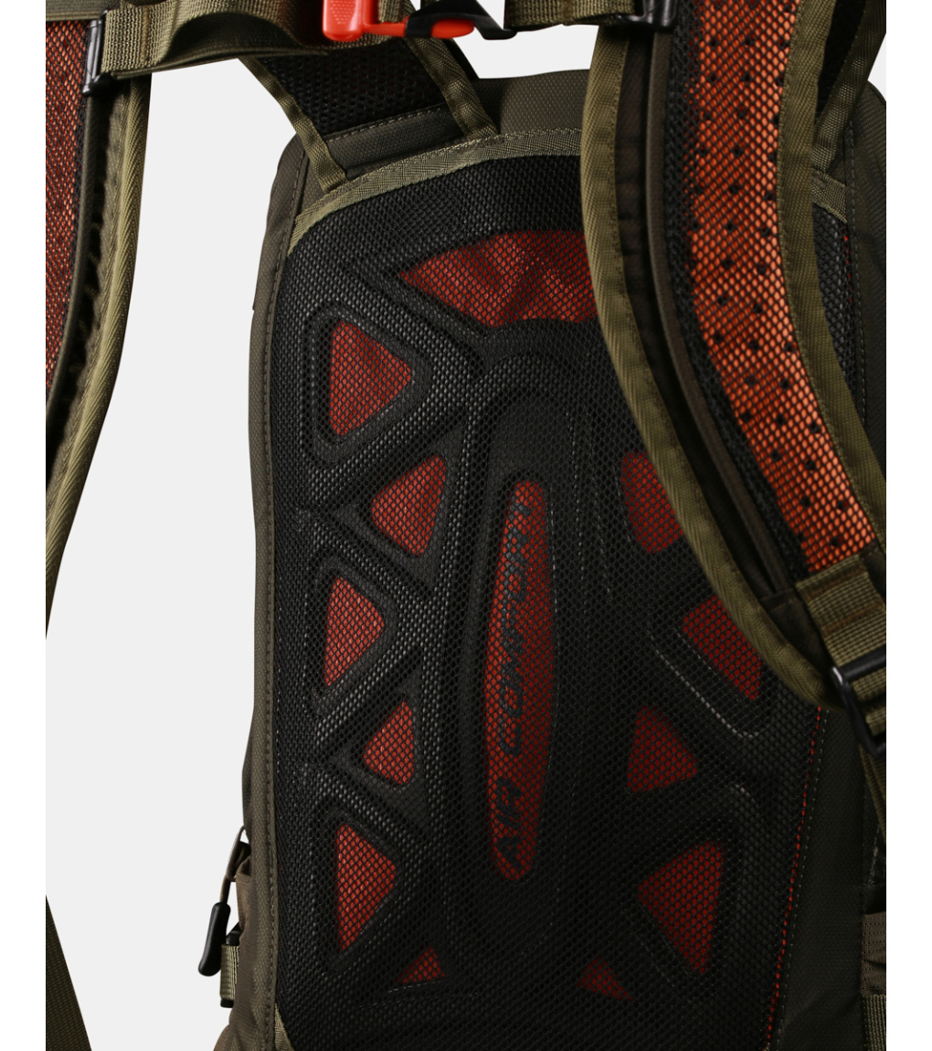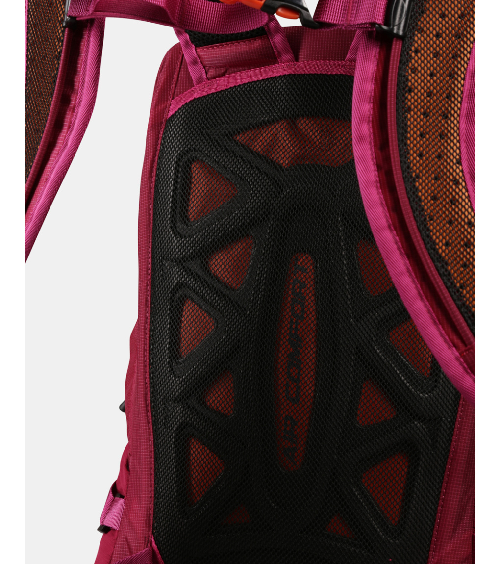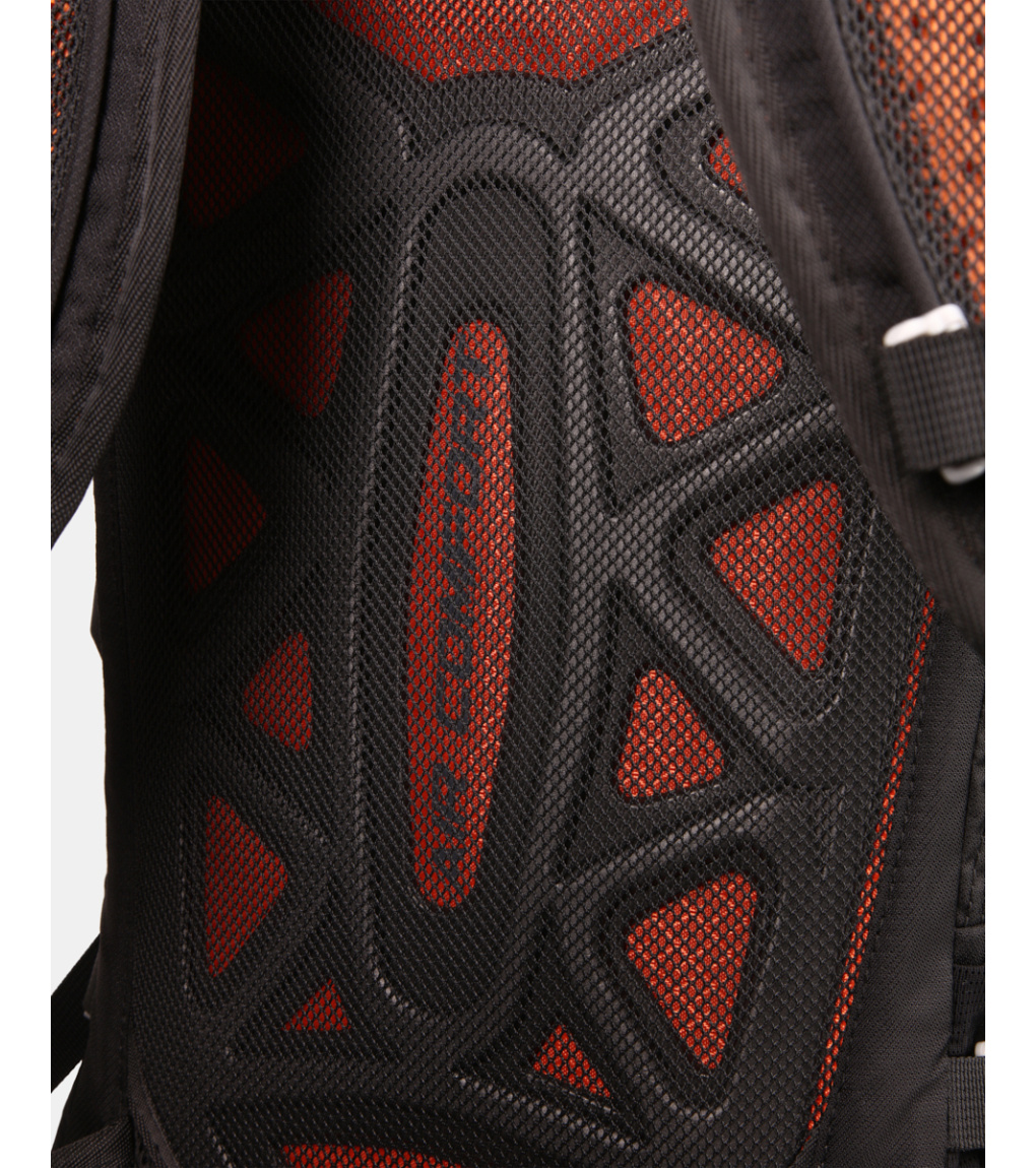 Chrbtový systém je mäkký a vypolstrovaný penovou výstuhou, ktorá zaisťuje pohodlie pri nosení a zároveň umožňuje prúdenie vzduchu medzi batohom a chrbtom. Tvarované a perforované ramenné popruhy podporujú lepšiu ventiláciu. Stabilitu pri pohybe zvyšujú výškovo nastaviteľné hrudné popruhy s integrovanou píšťalkou a polstrovaný bedrový pás, ktorý je navyše vybavený dvoma praktickými vreckami na zips.