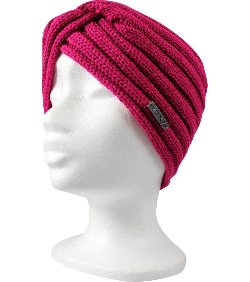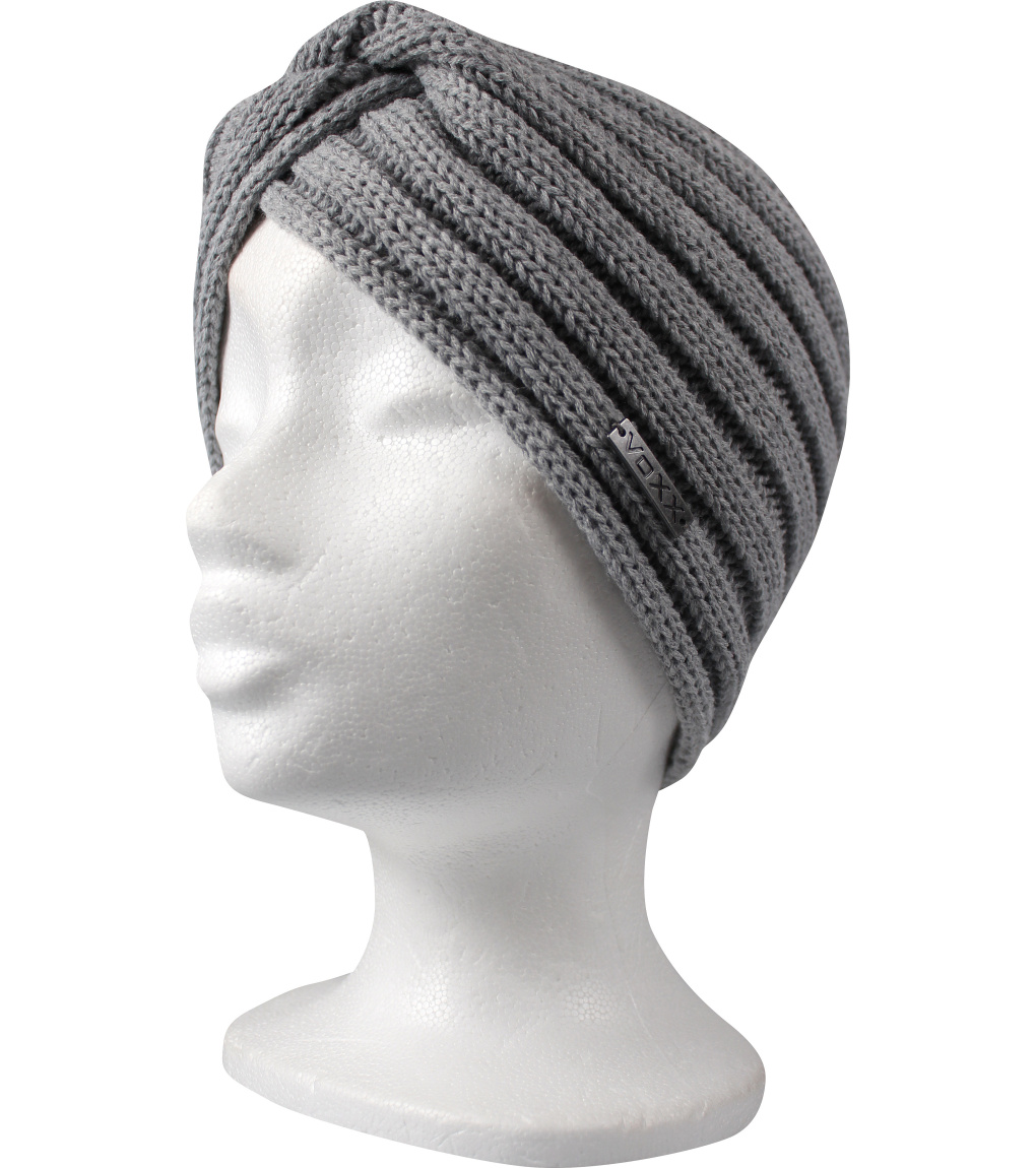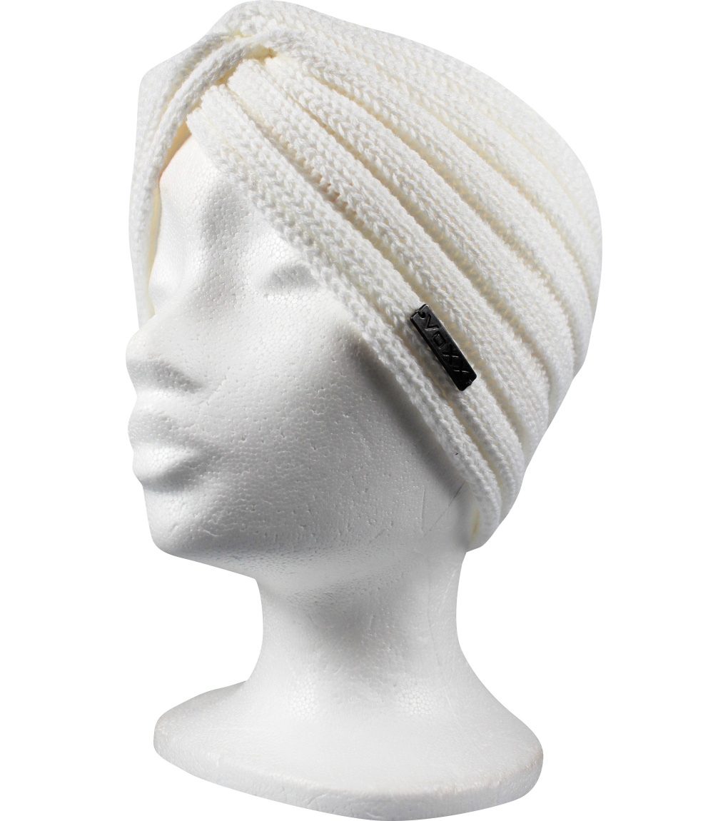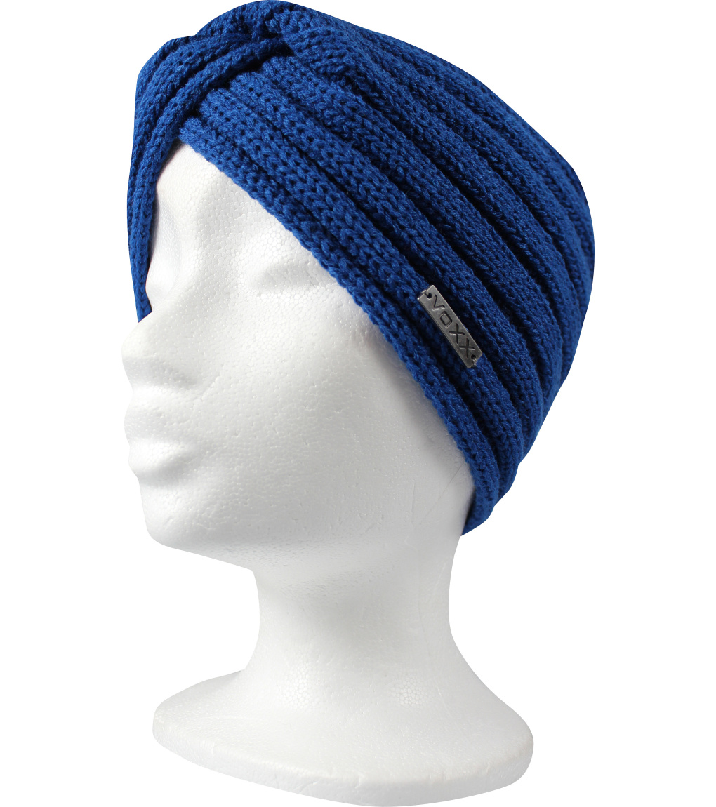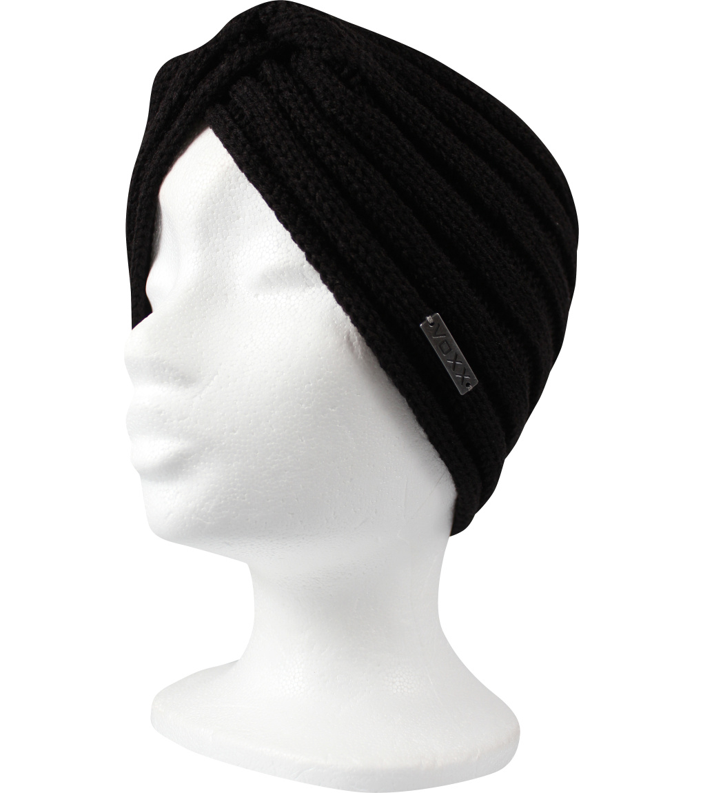 Dámska elegantná pletená čelenka so zákrutou na prednej strane, zdobená kovovým štítkom VoXX.