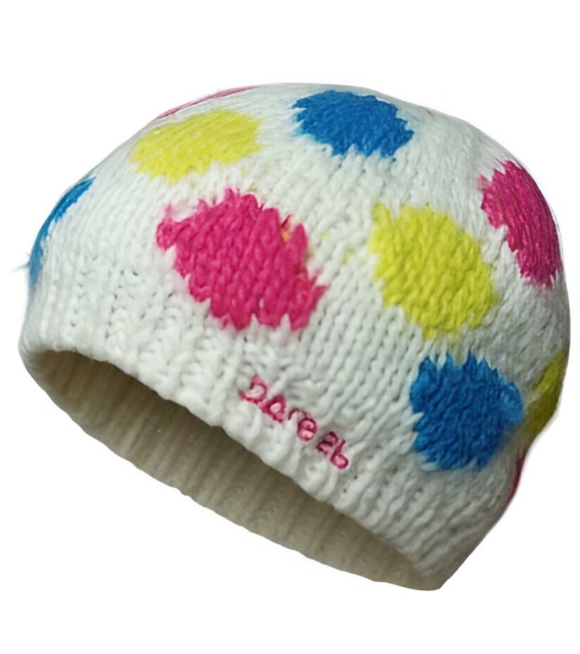 Štýlová pletená čiapka v bielej farbe s veselým bodkovaným vzorom je ideálnou voľbou pre chladné dni. Farebné bodky v odtieňoch ružovej, žltej a modrej dodávajú čiapku hravý a moderný vzhľad, ktorý zaujme na prvý pohľad.