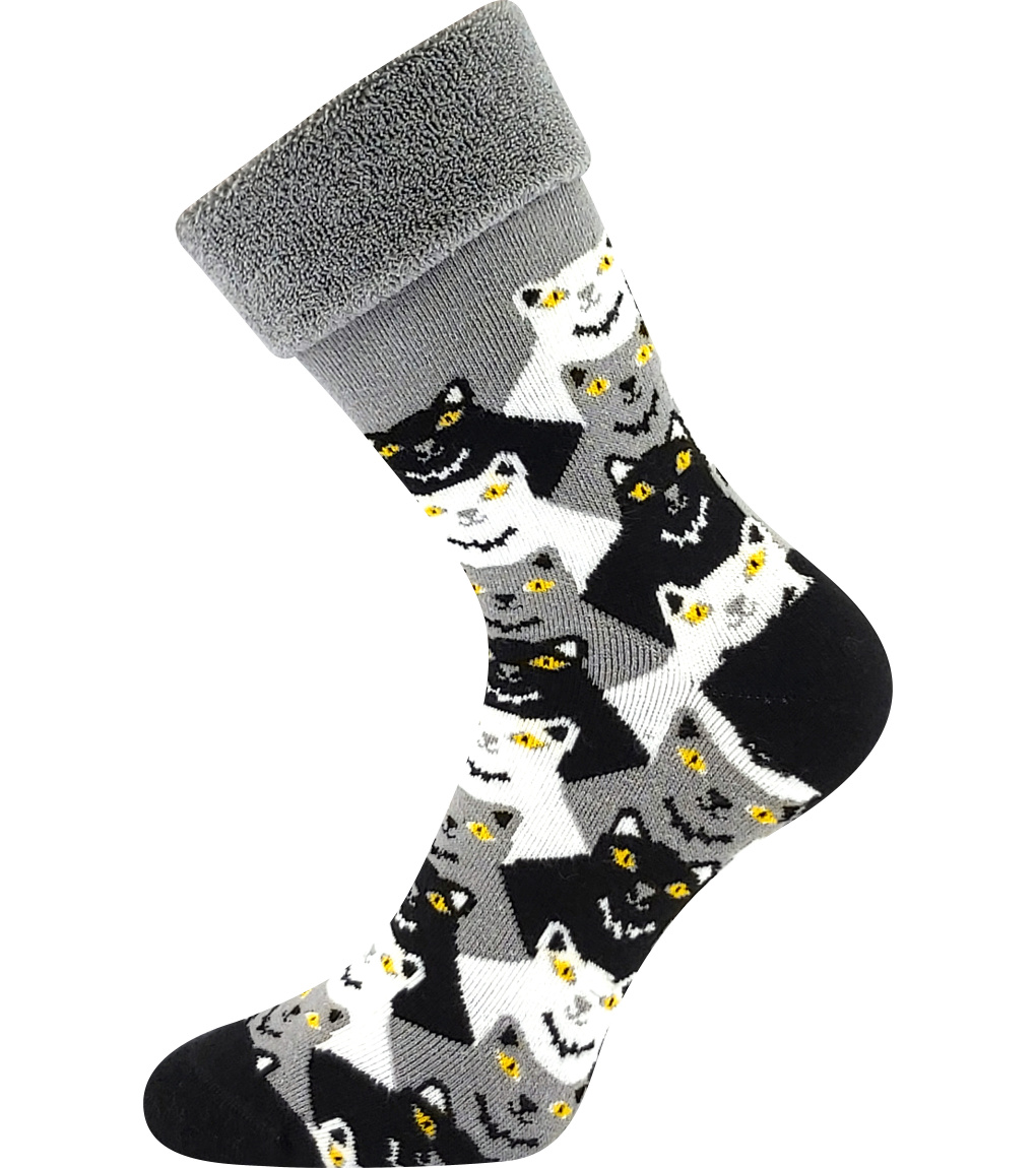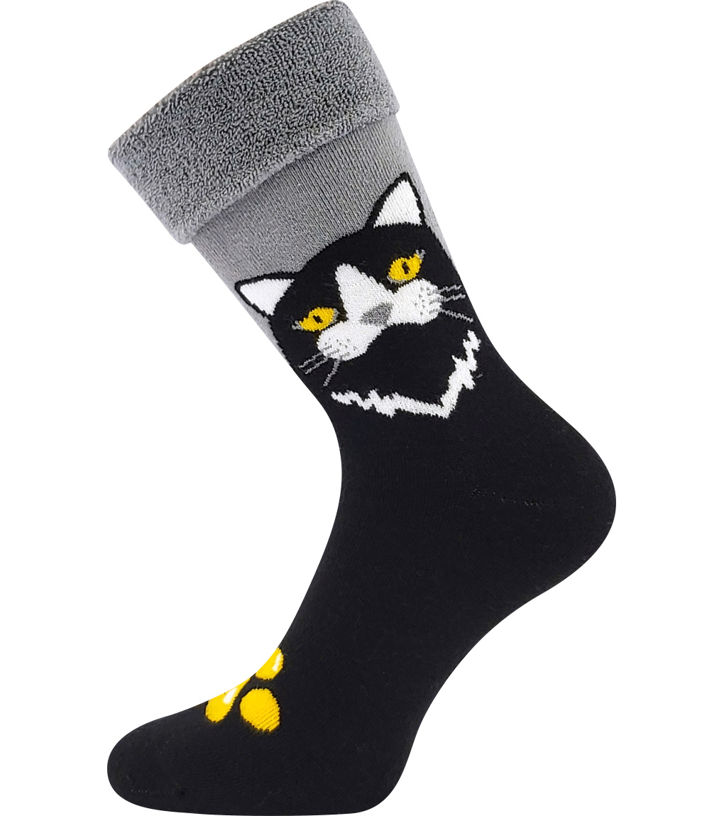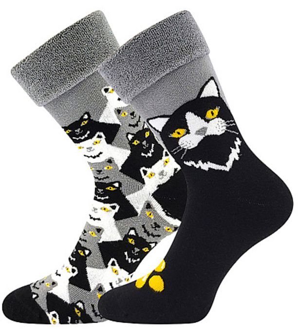 Dámske hrubé ponožky Lonka® LISA s obrázkami mačiek. Ponožky majú vysoký podiel bavlny a elastanu. Vďaka tomu sú ponožky mäkké na dotyk, príjemné na nosenie, dobre absorbujú vlhkosť a zároveň dobre držia na nohe. Hrejivé ponožky sú vyrobené z mäkkého a hebkého froté, takže sú veľmi pohodlné, vhodné na bežné nosenie počas chladných a sychravých dní. Špička ponožiek je spojená retiazkou a spoj nikde netlačí. S ohrnutým lemom alebo sa dajú nosiť natiahnuté. Párovanie 1+1, v ktorom je každá ponožka iná, ale spolu tvoria dokonalý pár. Ak chcete dve rovnaké ponožky, objednajte si dva páry.