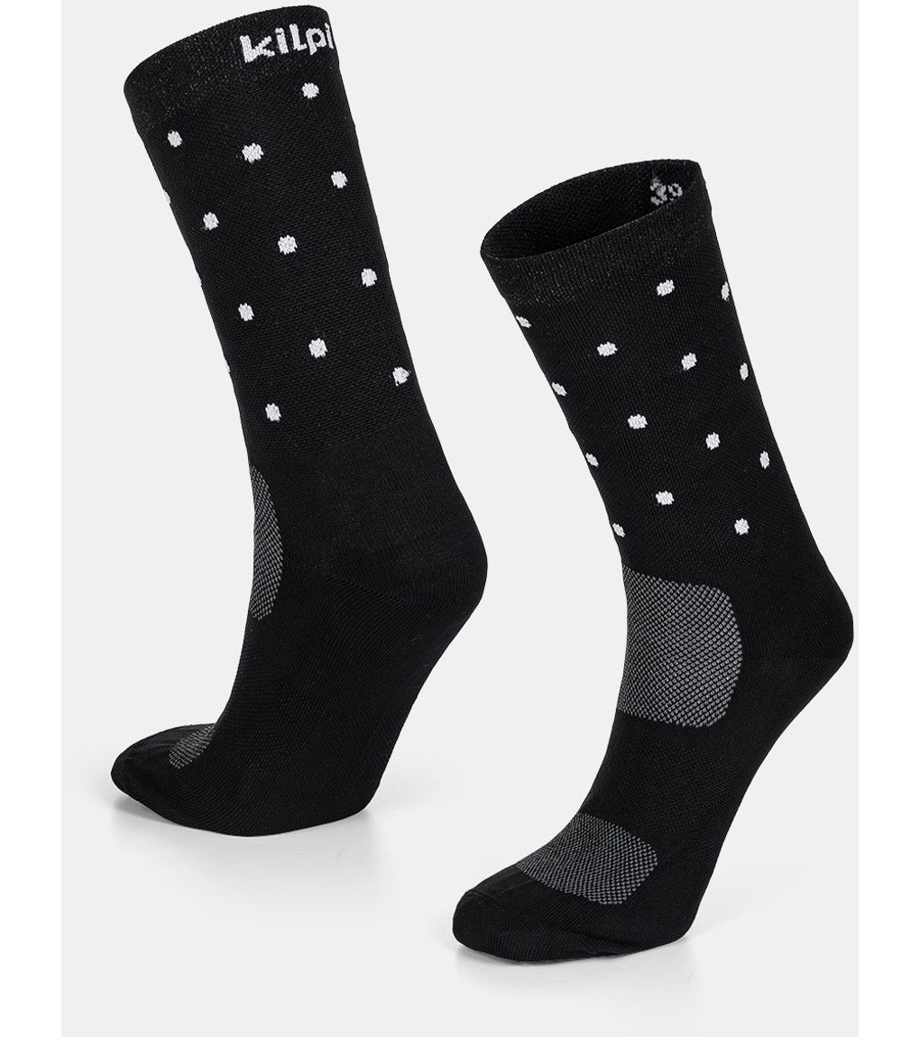 Ponožky Kilpi DOTS-U poskytujú klimatický komfort vďaka elastanovému úpletu, syntetickým vláknam a bezšvovej štruktúre. Tenký a priedušný materiál je ideálny na intenzívne športové aktivity v lete. Starostlivo umiestnené funkčné zóny ponúkajú oporu a zvyšujú tak pôžitok z tréningu. Široký elastický horný lem netlačí a nebráni krvnému obehu. Fixačný lem okolo členku stabilizuje polohu ponožky. Výška ponožiek do polovice lýtok je ideálna na bicyklovanie alebo korčuľovanie, chráni pred prípadnými odreninami. K dispozícii je niekoľko pestrofarebných vzorov s bodkami, ktoré dokonale dopĺňajú oblečenie s cyklistickými dresmi z našej ponuky.