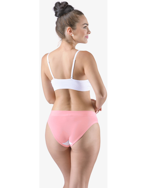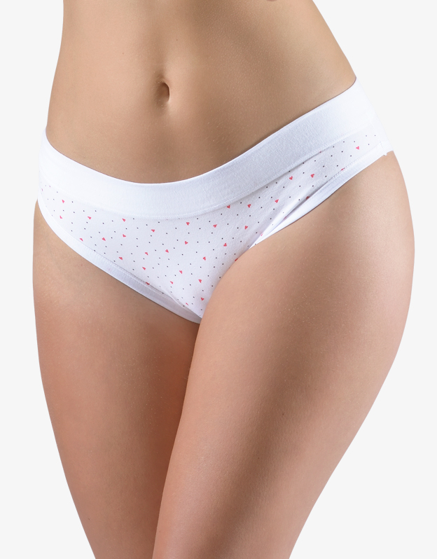 Bokové nohavičky so širším bokom, bokovky, a so širším pásovým lemom, dámske šité prádlo. Pásový kraj je začistený širším lemom z rovnakého materiálu. Nohavičky sú začistené úzkym lemom z rovnakého materiálu. Predný diel je potlačený. Zadný diel a lemy sú jednofarebné.