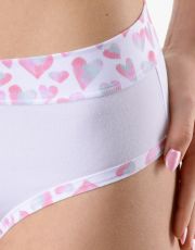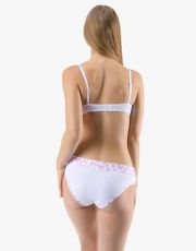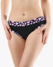 Bokové nohavičky so širším bokom a so širším pásovým lemom, dámske šité prádlo. Pásový kraj je začistený širším lemom z rovnakého materiálu. Nohavičky sú začistené úzkym lemom z rovnakého materiálu. Lemy v páse av nohavičkách sú potlačené. Predný a zadný diel je jednofarebný.