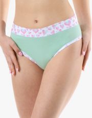 Nohavičky klasického strihu so širším pásovým lemom, dámske šité prádlo. Pásový kraj je začistený širším lemom z rovnakého materiálu. Nohavičky sú začistené úzkym lemom z rovnakého materiálu. Predný diel je jednofarebný, lemy v páse av nohavičkách sú potlačené.