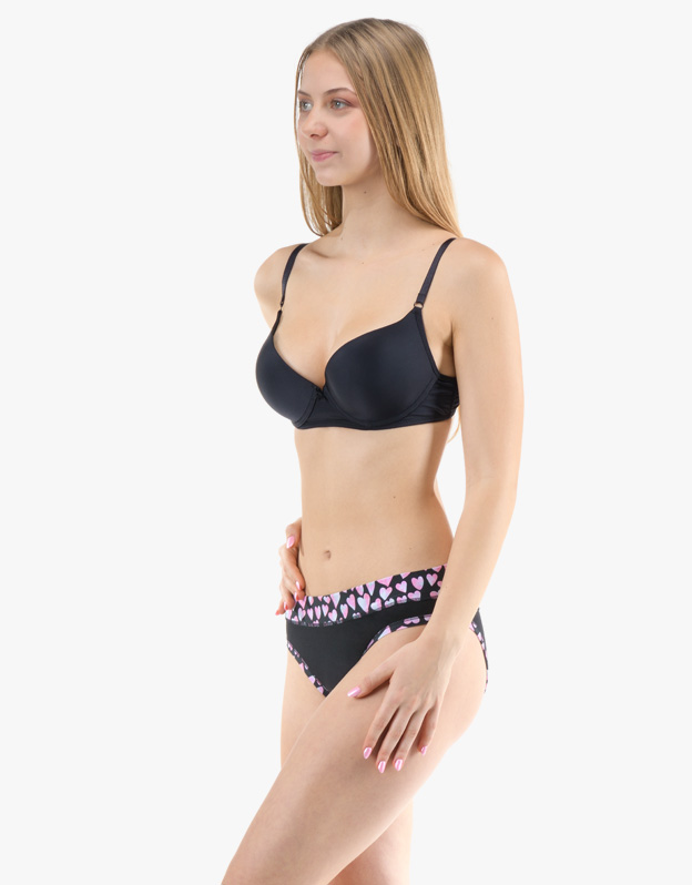 Nohavičky klasického strihu s úzkym bokom a širším pásovým lemom, dámske šité prádlo. Pásový kraj je začistený širším lemom z rovnakého materiálu. Nohavičky sú začistené úzkym lemom z rovnakého materiálu. Predný diel je jednofarebný, lemy v páse av nohavičkách sú potlačené.