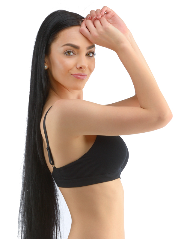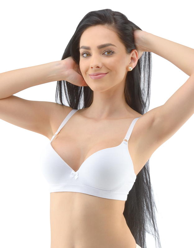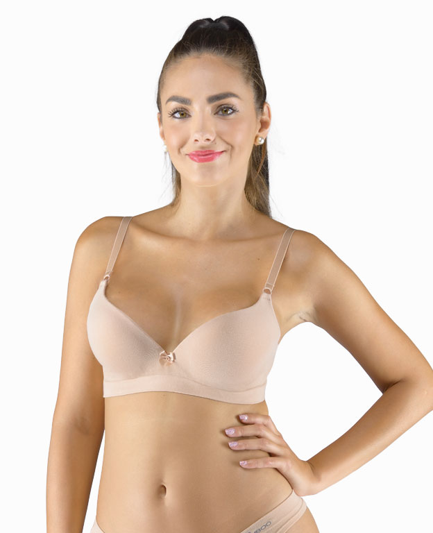 Nadprsenka s kosticami a lisovanými košíčkami, dámske bezšvové spodné prádlo. Vonkajšia časť podprsenky je vyrobená z bambusového materiálu, košíčky sú z polyuretánovej peny, ktorá je zvnútra potiahnutá bavlneným materiálom. Okraje košíčkov sú hladké bez lemovania. Ramienka sú nastaviteľné. Podprsenka je jednofarebná. Má trojradové zapínanie na 2 háčiky. Na prednej strane je mašlička. Podprsenka je vhodná na každodenné bežné nosenie.
