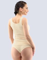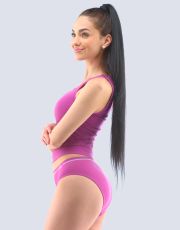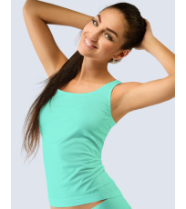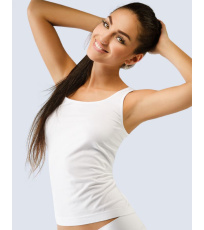 Dámske bezšvové tielko so širšími ramienkami. Spodný okraj je bezšvovo všitý. Prieramky a výstrih sú obšité úzkou gumou. Ramienka sa vpredu mierne zužujú, čím vytvárajú pekne tvarovaný výstrih. Tielko je jednofarebné. Je bez loga. Tielko má predĺženú dĺžku.