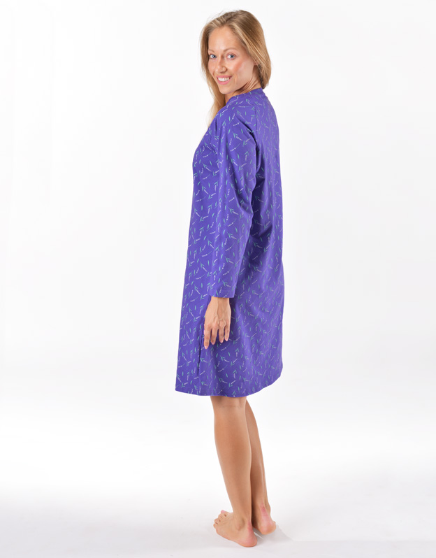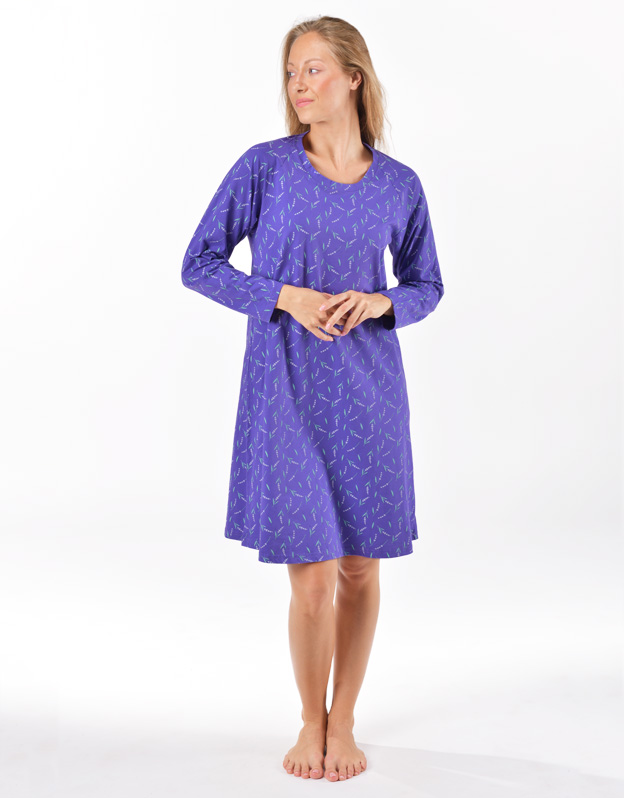 Základom kvalitného spánku je vaše pohodlie, ku ktorému vám pomôže aj pohodlná nočná bielizeň. Nočná košieľka má potlač s motívom levandule, dĺžku po kolená, dlhý rukáv a okrúhly výstrih. Každú milovníčku prírodných materiálov poteší materiál zo 100% bavlny, ktorý vám zaistí pohodlie po celú noc.