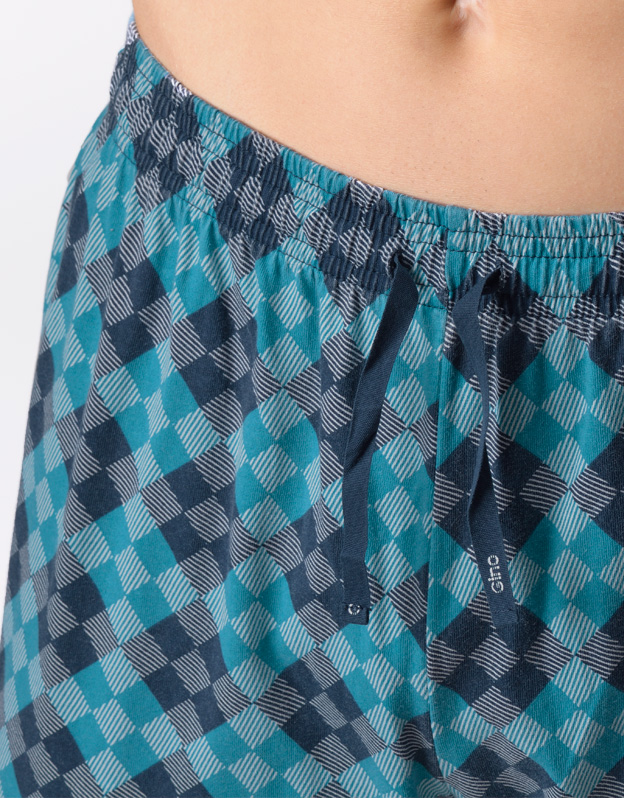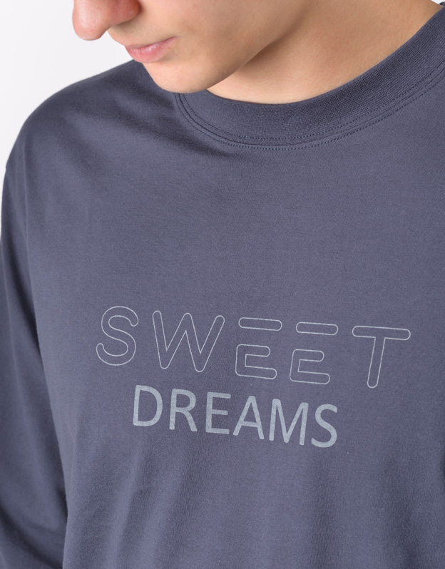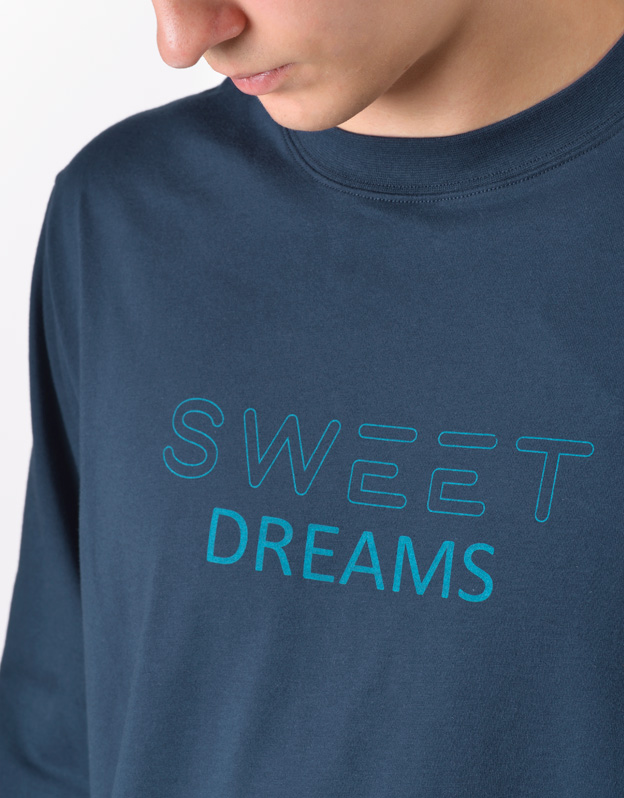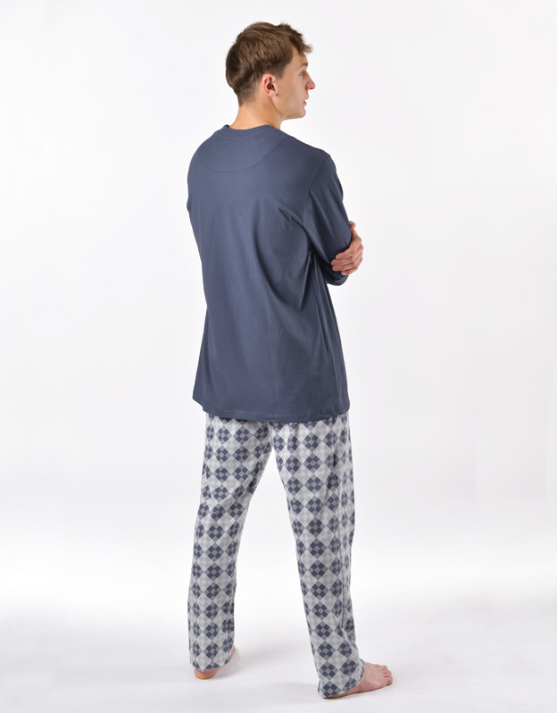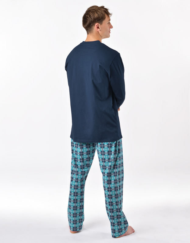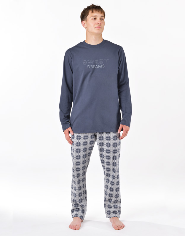 Pánske klasické pyžamo voľného strihu z jemného úpletu Vám poskytne pohodlie počas spánku. Nohavice s výraznejším vzorom dopĺňa tričko s dlhými rukávmi a potlačou na hrudi.