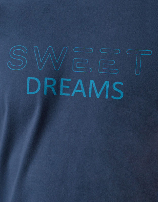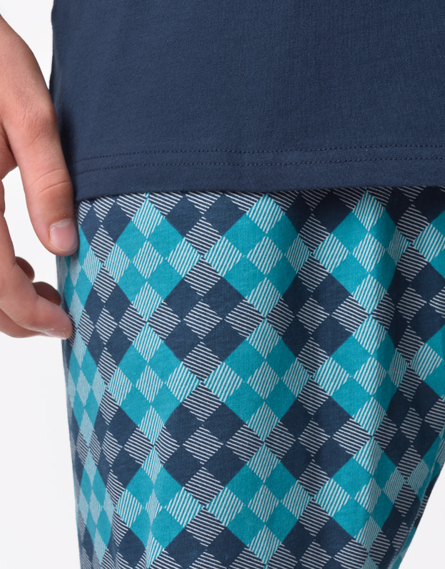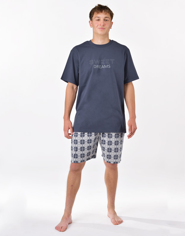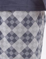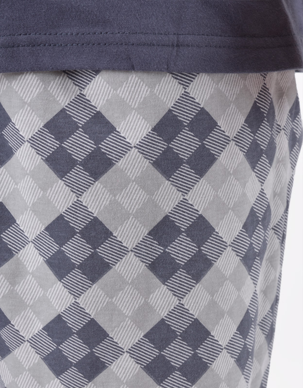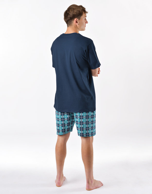 Pánske pyžamo voľného strihu z jemného úpletu Vám poskytne pohodlie počas spánku. Krátke nohavice s potlačou dopĺňa tričko s väčšou potlačou na hrudi a krátkymi rukávmi.